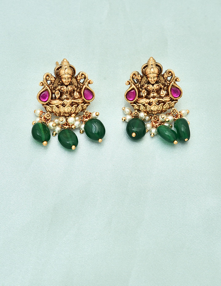 Grace your traditional look with this Matt Kempu Lakshmi Devi Long Haram, featuring radiant ruby & emerald stones with elegant gold balls. Complete with matching earrings, it’s a timeless piece that adds rich desi charm and makes every occasion special.
