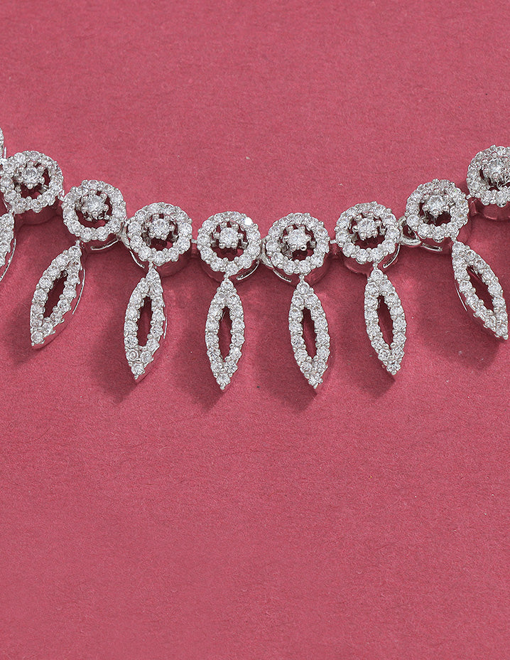 This Designer Zirconia Elegance Necklace Set features two lines of shimmering white zirconia stones, expertly set in rhodium-plated metal for a radiant, lasting shine. Its refined design offers a sophisticated touch to any ensemble, enhancing your elegance for special occasions or daily wear.