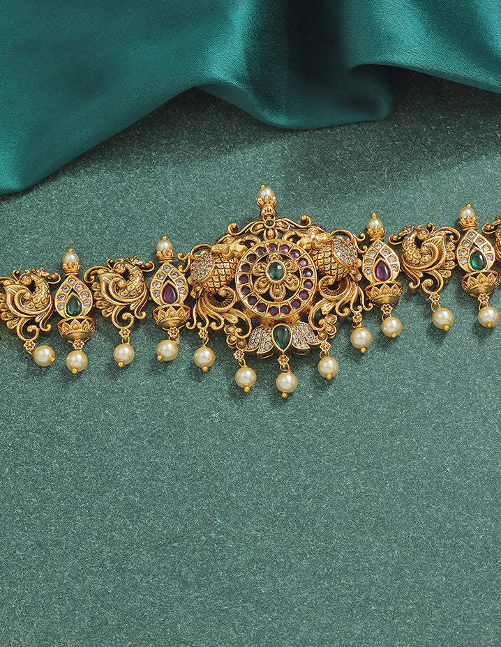 This Matt Chain Vaddanam has a chic and ethnic design. Adorned with CZ Stones, Pearls and green Beads attached as a Hanging to look Beautiful , it can be styled with various outfits, including indo-western ones.