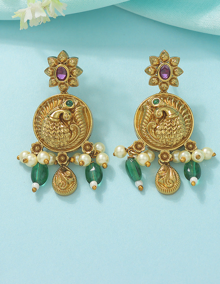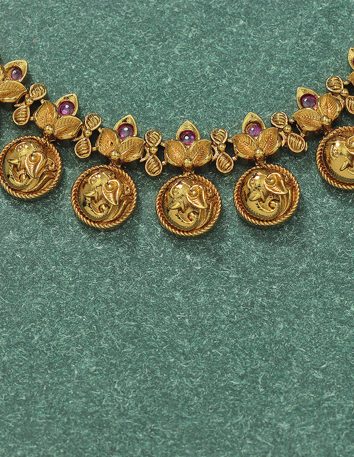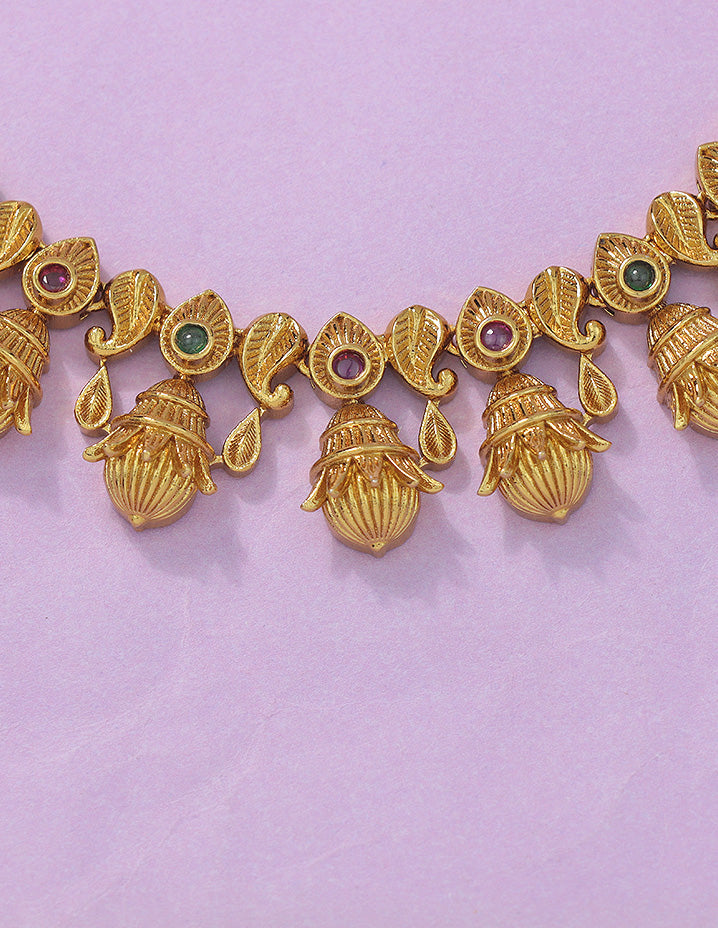 This Matt Gold Plated Kempu Long Haram Set, adorned with AD stones, is a celebration of timeless tradition. Paired with matching earrings, it’s the perfect pick to elevate your ethnic style with regal elegance.