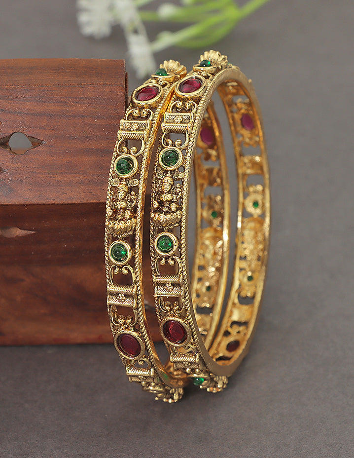 Elegant and timeless, these Designer Zirconia Bangles feature ruby, emerald, and white stones with a rich gold polish. A perfect pair for formal and special occasions.