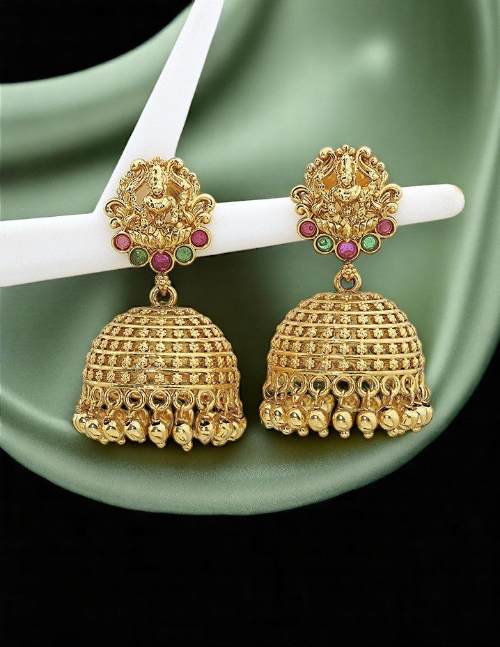 Adorned with intricate temple motifs, vibrant stones, and delicate pearl hangings, these antique gold jhumkas exude traditional charm—perfect for cultural celebrations and bridal elegance.