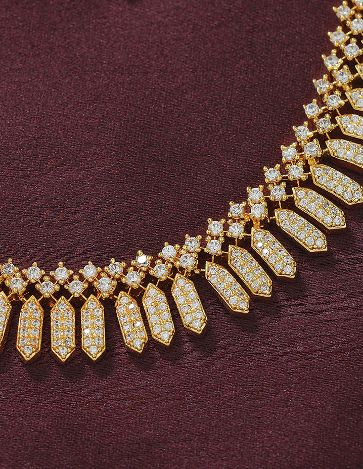 Elevate your style with this Designer Zirconia Elegance Necklace Set, featuring radiant white stones and a refined gold polish for timeless sophistication. Perfectly crafted to add a luxurious touch to any ensemble.