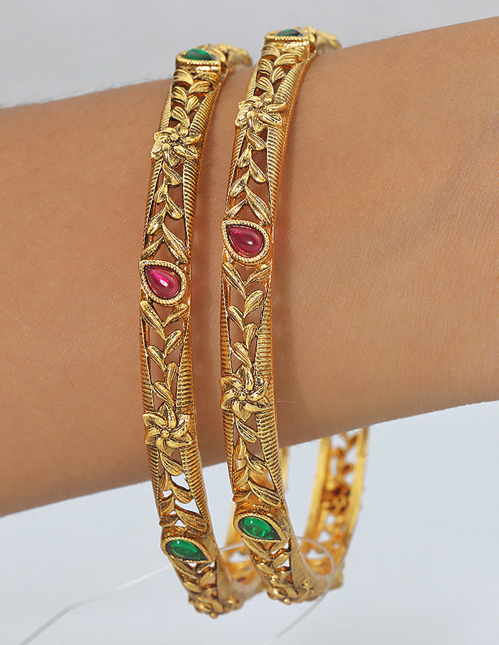 A stunning pair of gold-finish bangles adorned with intricate floral carvings and vibrant red and green stone accents—perfect for festive elegance or timeless tradition.