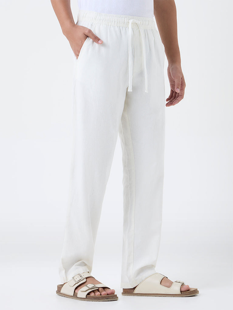 These off-white pants from Bombay Paisley redefine everyday dressing. Crafted for comfort with side pockets and an elasticated waistband featuring a button-zip fly, they’re finished with a braided leather belt that adds a touch of earthy sophistication.
