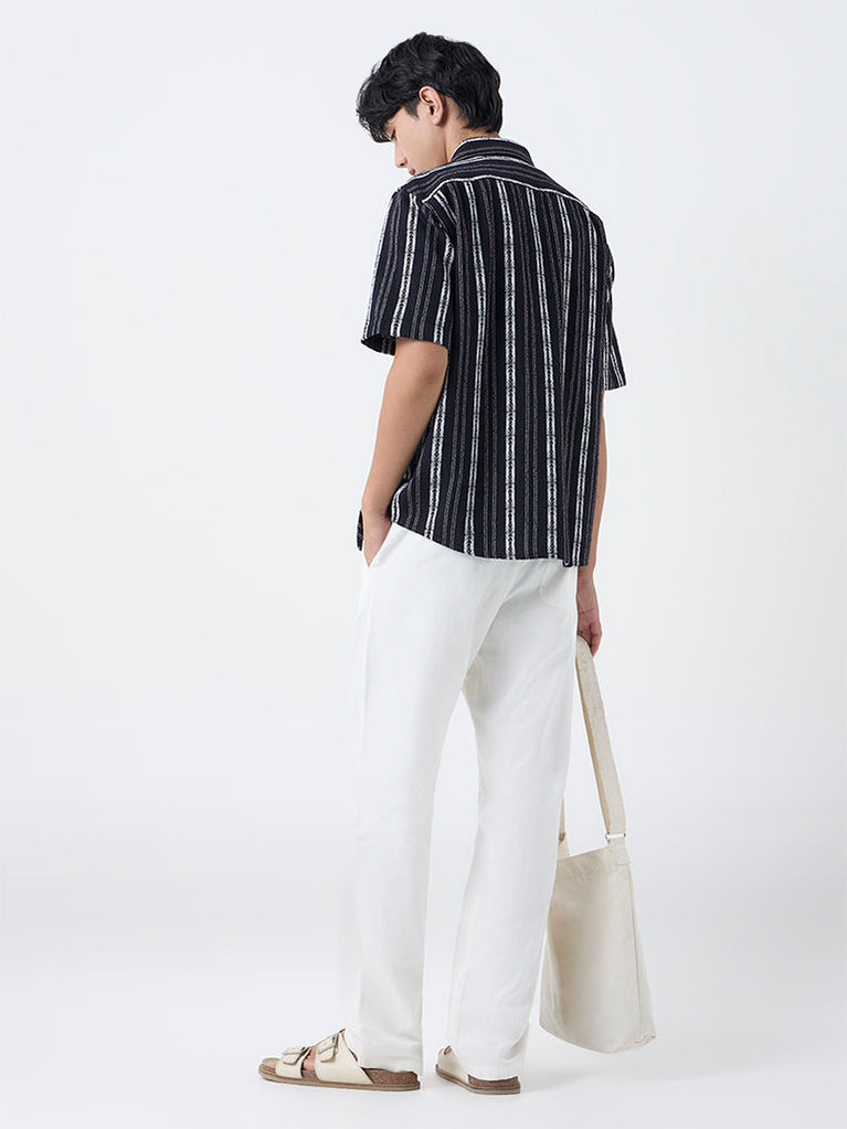 These off-white pants from Bombay Paisley showcase geometric-inspired motifs that add a subtle yet striking touch. Made from a premium cotton-linen blend, they feature a buttoned waist, zipper fly, and practical belt loops. Designed with side pockets for everyday ease, this pair balances comfort with contemporary charm.