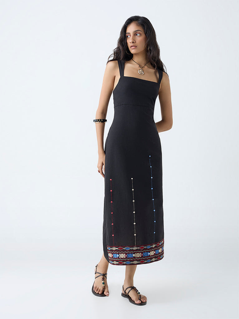 Bombay Paisley presents this black A-line dress styled with a round neck and a sleeveless cut for an easy silhouette. Featuring embellished embroidery on a breathable fabric build, it lends a subtle festive touch to everyday ethnic dressing.