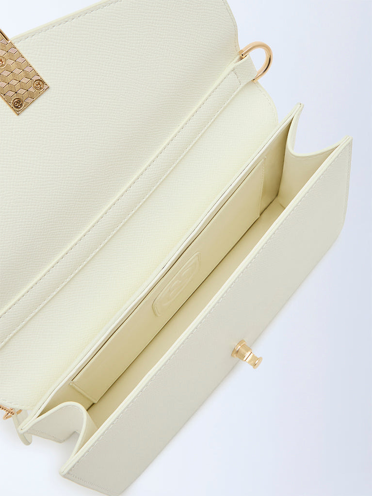 DescriptionDefined by modern elegance, this clutch creates a polished look.Accented with gold-tone detailing and a signature turn-lock closure, it features a chain strap for versatile styling.Crafted from genuine leather, the pocketed interior comfortably holds your phone, cards, and keys, making it an effortless go-anywhere carryall.