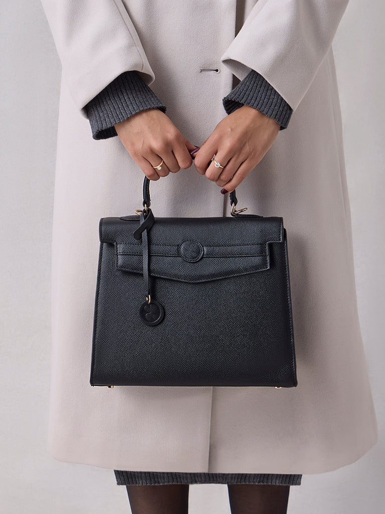 DescriptionA modern expression of a fashion classic design.Crafted from finest leather, it features a structured top handle, a signature push-lock closure, and a detachable strap for effortless crossbody wear.Polished and versatile, it is the perfect choice for days when you want to feel impeccably put together.