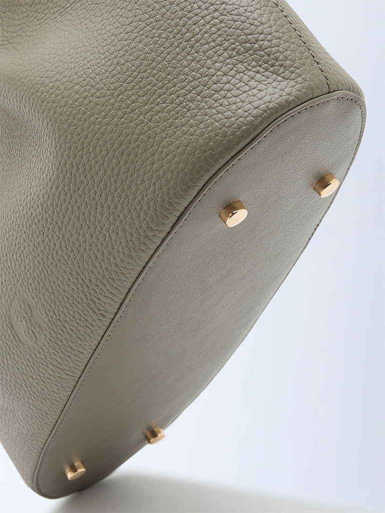 Details•Stone grey grain leather•Quality lining•Detachable shoulder strap with pouch•Internal gold zip and slip pockets•Protective gold feet