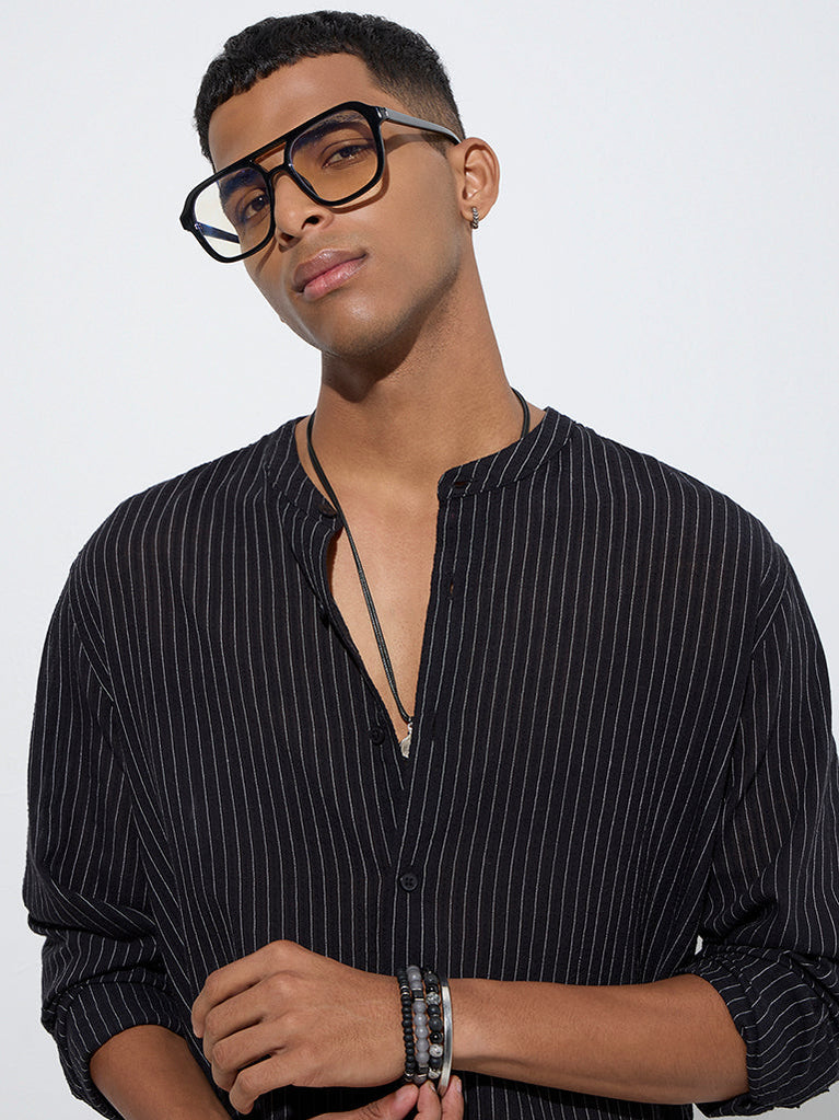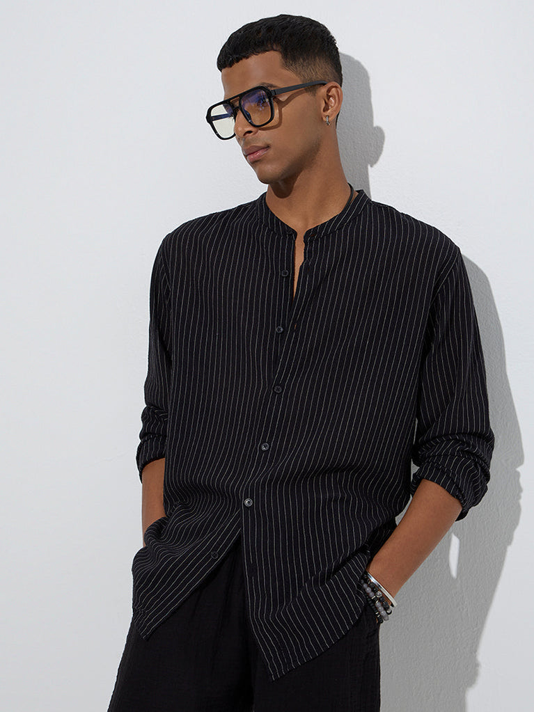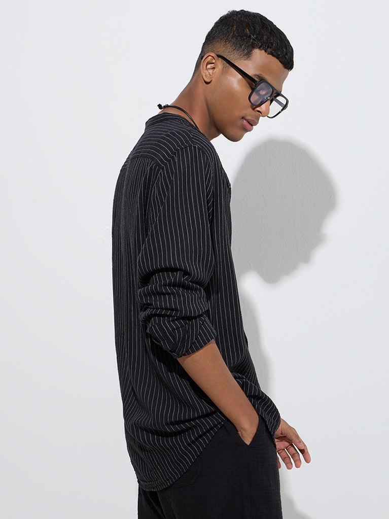 This black shirt by ETA is defined with striped prints that lend it a modern edge. Created from a lightweight fabric in a relaxed silhouette, it features a band-neck collar, a button placket, and full sleeves with buttoned cuffs.