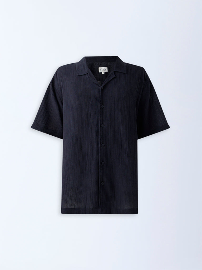 This black shirt from ETA is milled from pure cotton and finished with a subtle crinkle texture for understated character. Cut in a relaxed silhouette, it features a camp collar, half sleeves, and a button placket for easy wear.