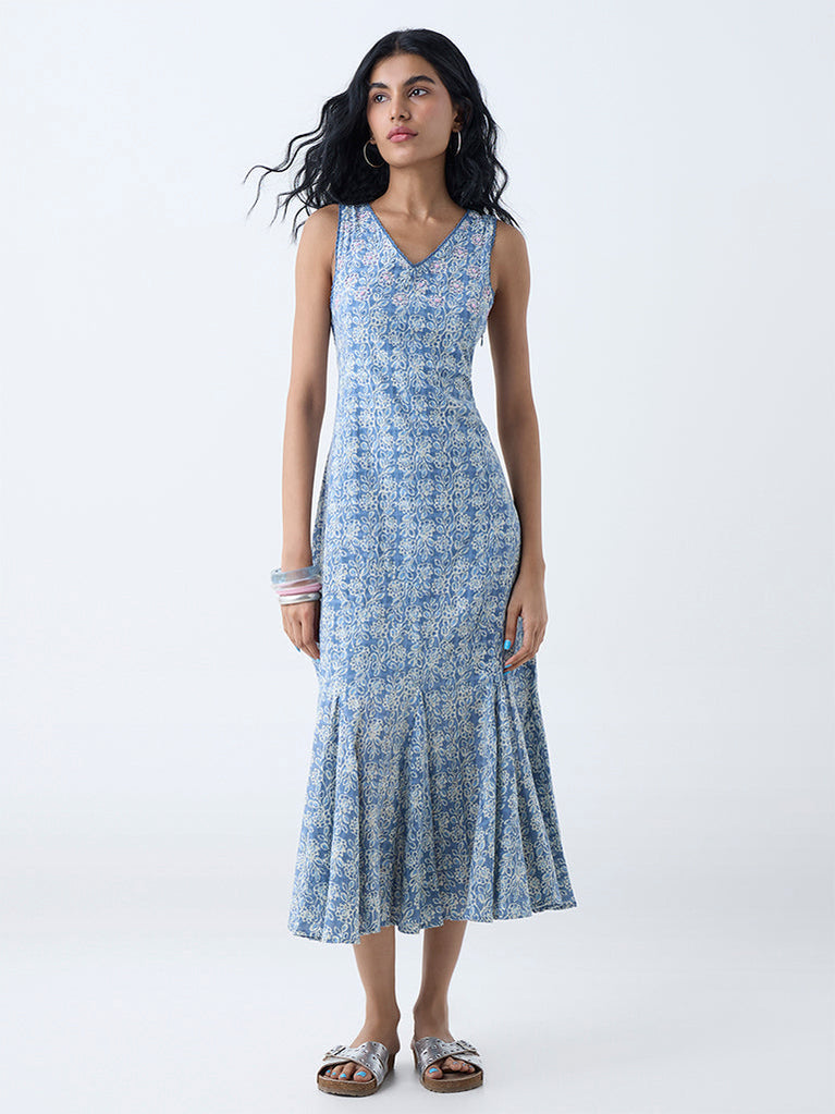 Bombay Paisley Blue Floral Design Cotton Drop-Waist Dress