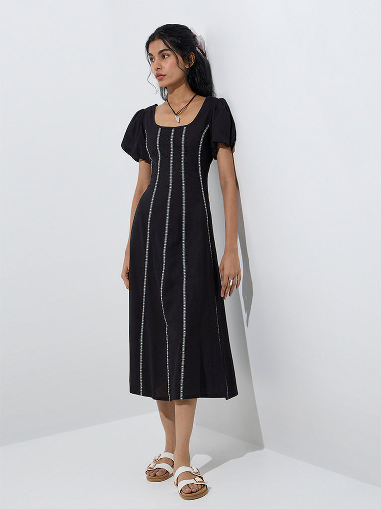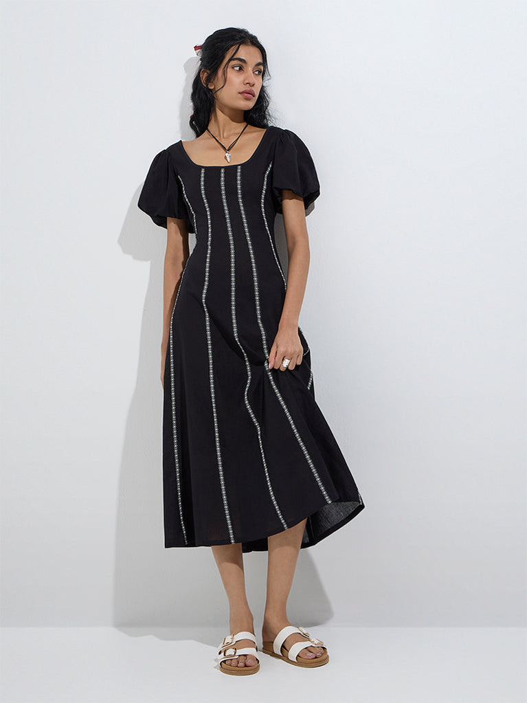 Shaped in a flattering A-line silhouette, this black dress from Bombay Paisley flaunts intricate embroidery that adds subtle artistry. Its breathable composition combines comfort with style, while a scoop neck, puff sleeves, and a back zipper ensure effortless wear.