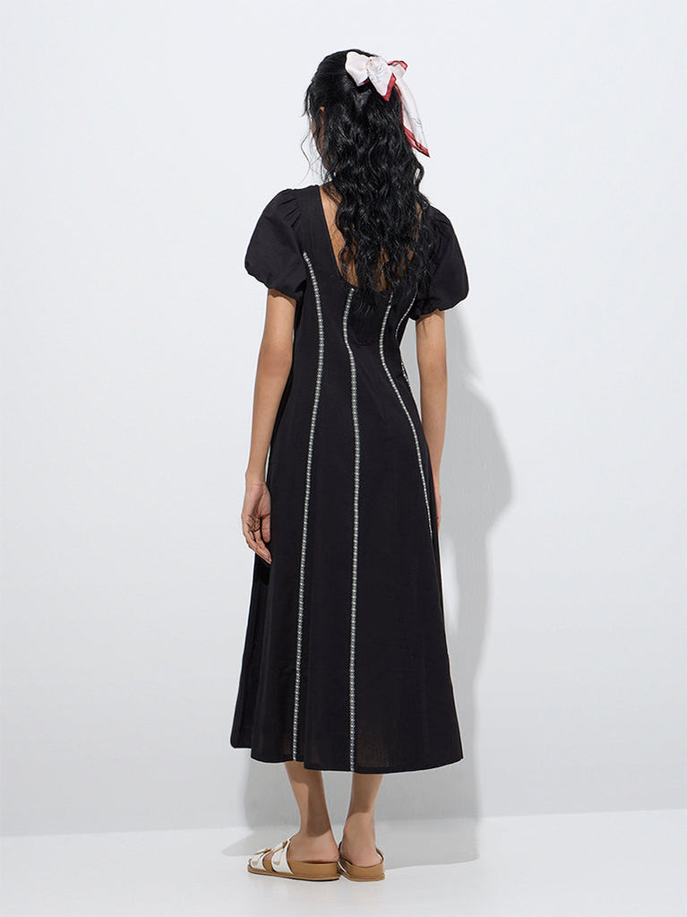 Bombay Paisley Black Embroidered Cotton-Blend A-Line Dress