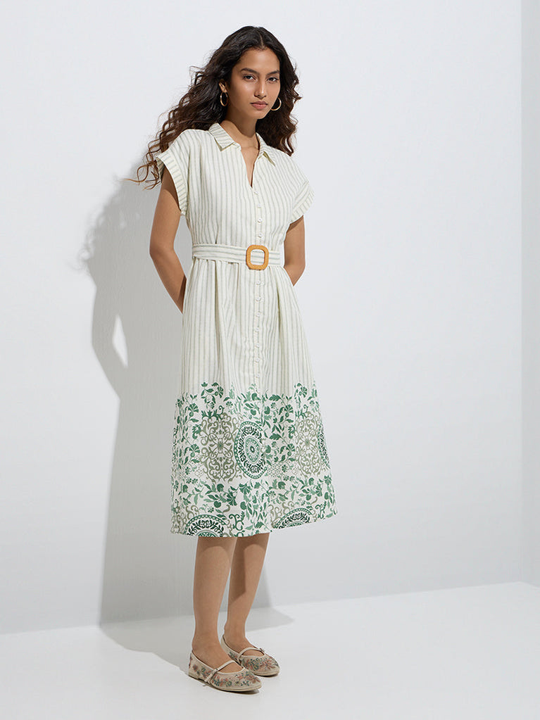 This green shirt dress from Bombay Paisley showcases a charming mix of striped prints and floral motifs. Created from a sumptuous cotton-linen blend in a flattering A-line silhouette, it features a V-neck collar and relaxed upturned dolman sleeves. A matching belt with a round buckle defines the waist, while side pockets offer everyday ease and functionality.