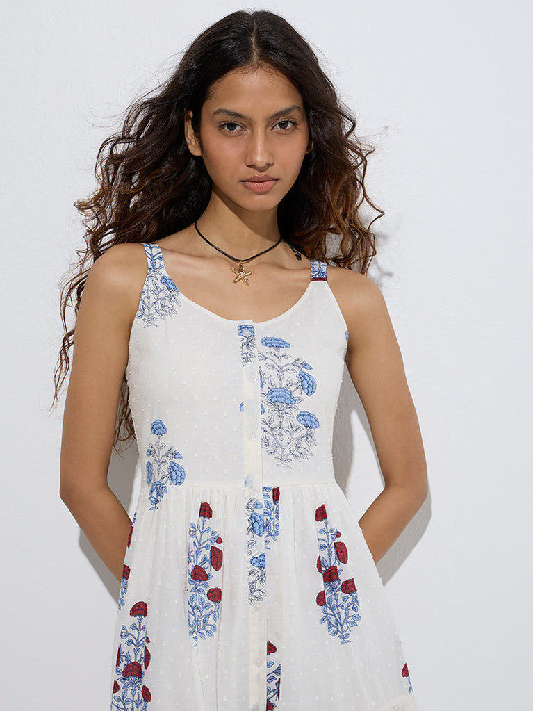 Bombay Paisley White Floral Pattern Cotton Tiered Dress