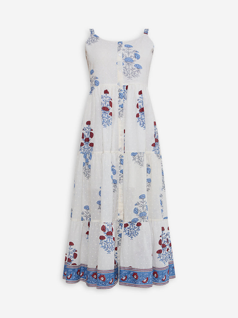 Bombay Paisley White Floral Design Cotton Tiered Dress