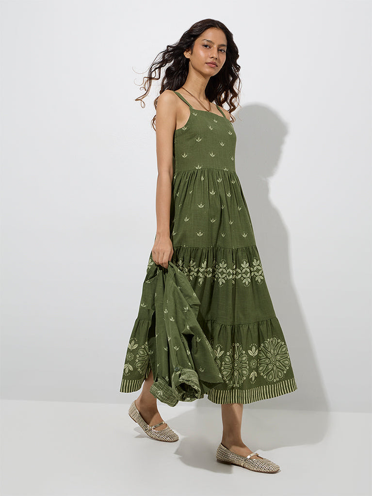 Bombay Paisley Olive Floral Cotton Tiered Dress with Jacket