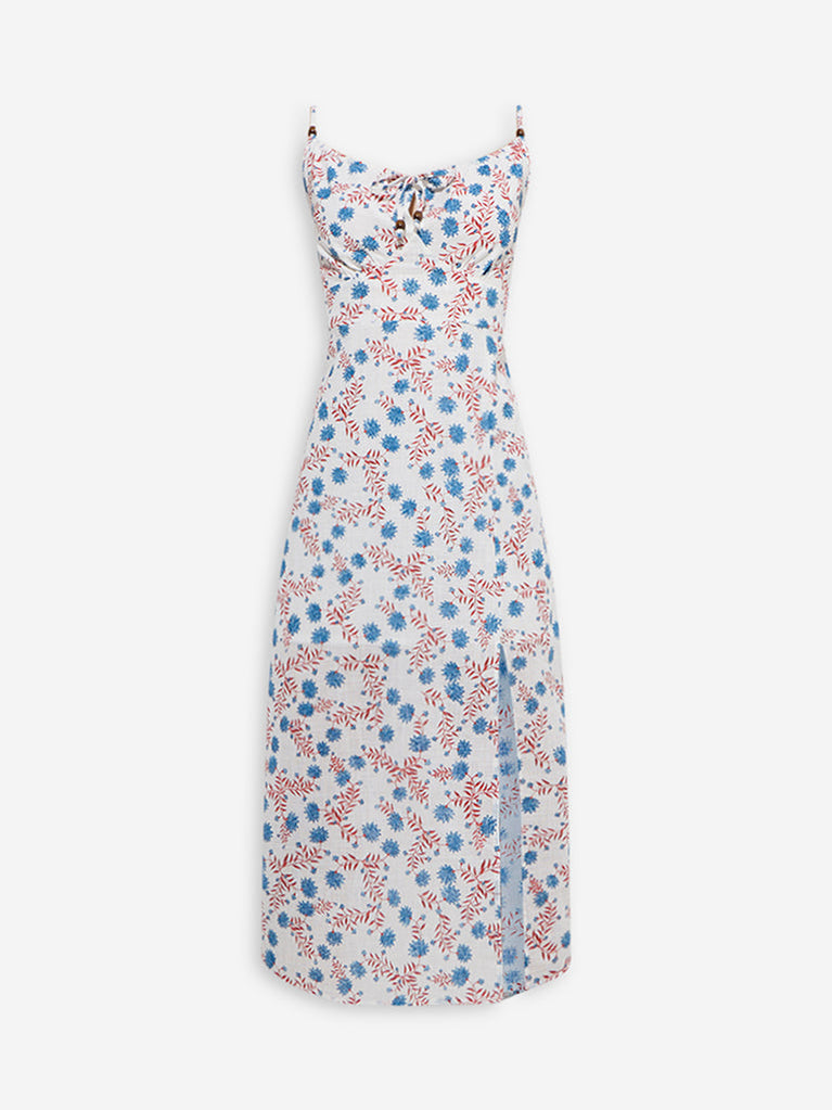 Bombay Paisley launches this white dress decked with floral motifs that enhance its feminine charm. Woven from pure cotton, it features a flattering V-neck with tie-up detailing, adjustable straps, and a smocked back for a comfortable fit. A slit at the front adds a sleek touch to the breezy silhouette.