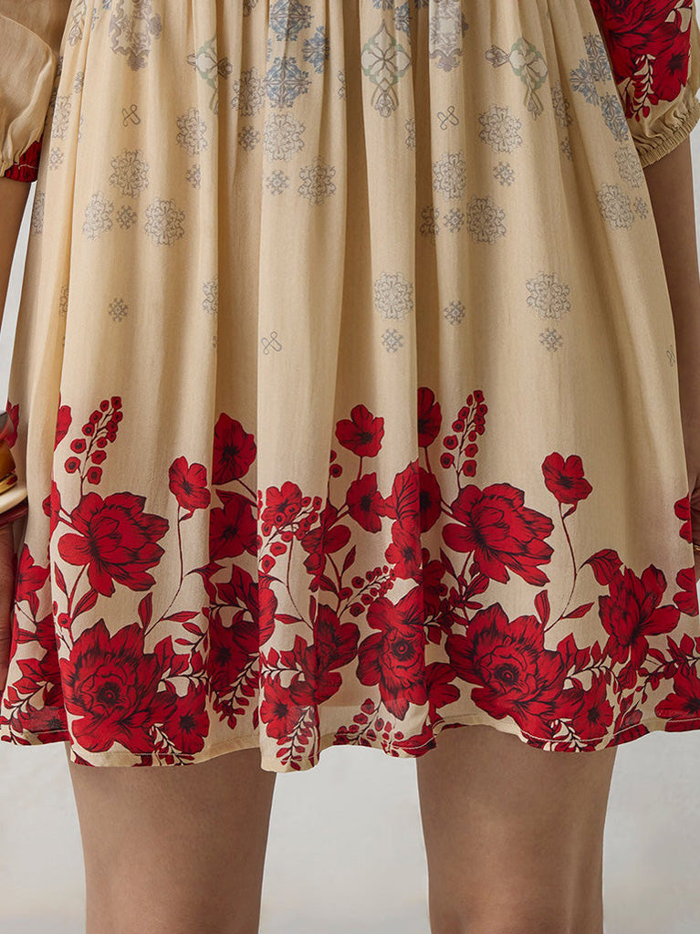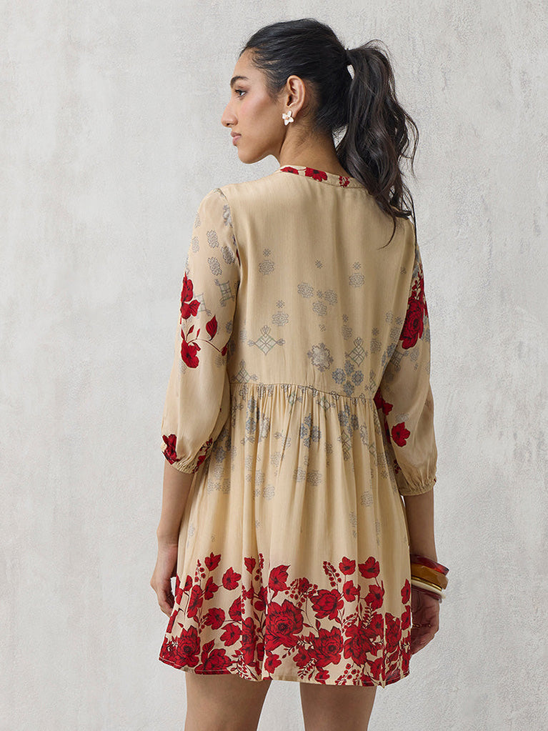 Brighten up your everyday collection with this beige mini dress crafted from a lightweight fabric for added comfort. This A-line dress is fashioned with a notched collar and button-fastening, three quarter sleeves as well as floral motifs all over for a feminine touch. It styles well with block heels and minimalistic jewellery for a chic outfit.