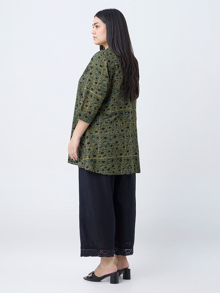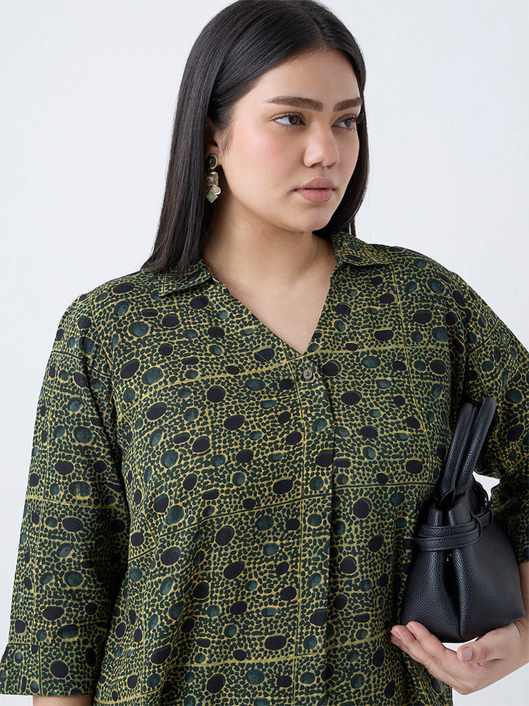 This green tunic from Diza features an all-over print that exudes understated charm. It’s designed with a V-neck collar leading to a single button-down detail and finished with three-quarter sleeves, offering a refined yet easy going silhouette for everyday wear.