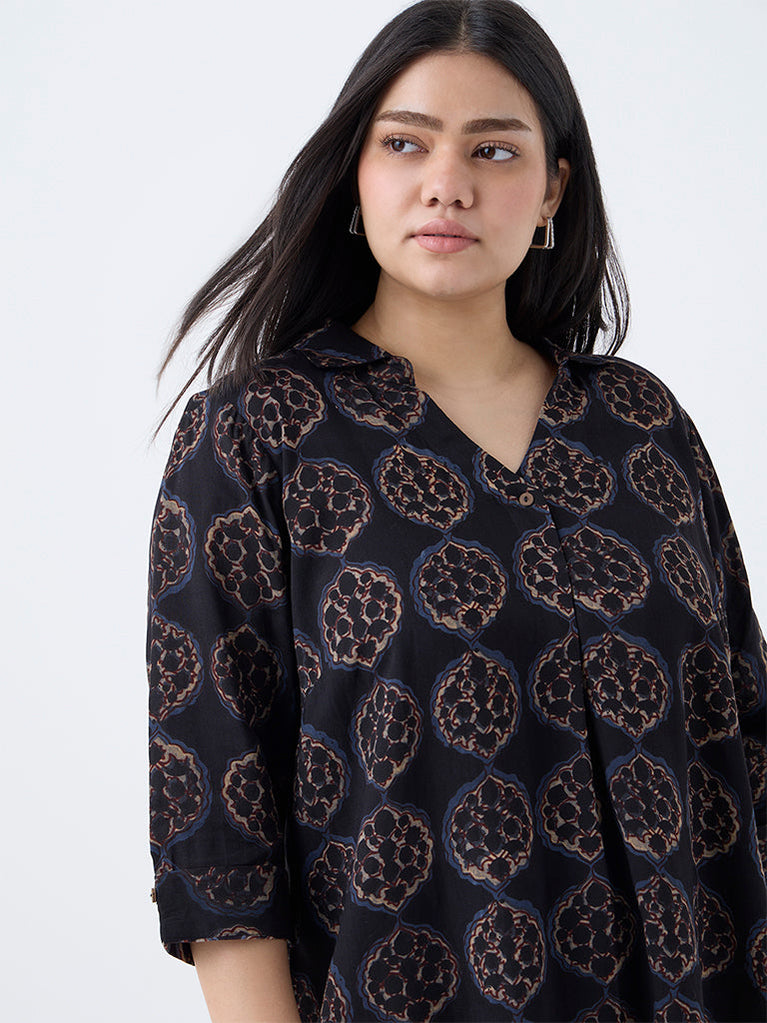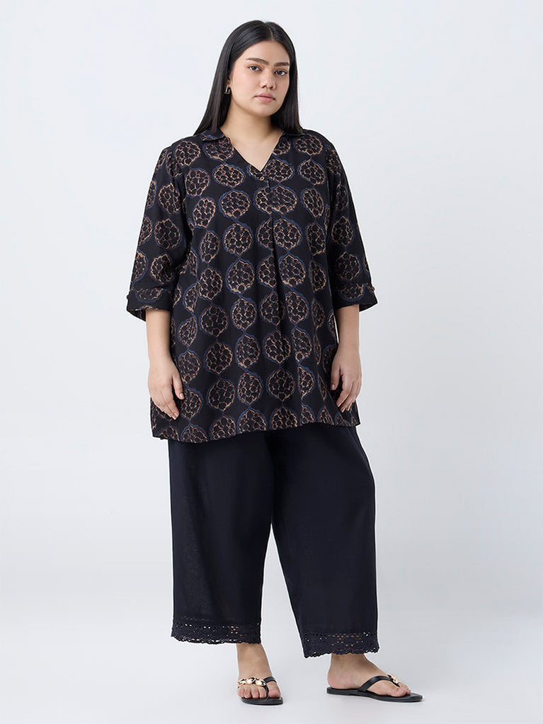 This black kurti from Diza is perfect for both casual and festive occasions. Designed with a flattering high-low silhouette in a smart shirt style, it boasts bold floral patterns for a touch of elegance. Pair with matching palazzos (sold separately) for a polished look.