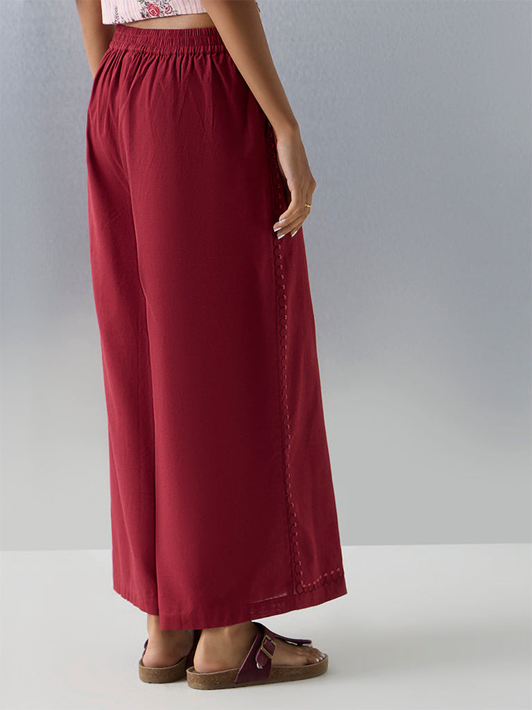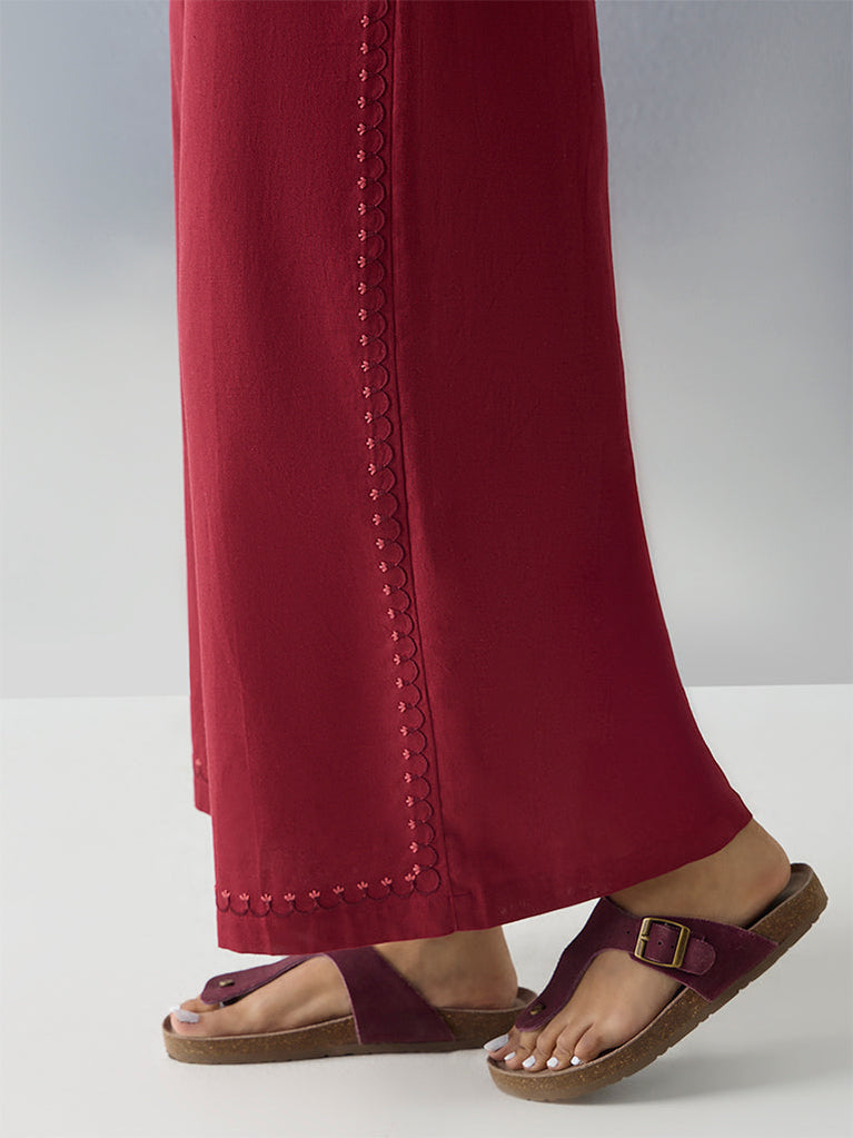 Crafted from a soft cotton-blend fabric, this maroon palazzos from Bombay Paisley combines comfort with elegant detailing. The sides are adorned with subtle embroidery, while the smooth elastic waistband and side pockets ensure ease and functionality.