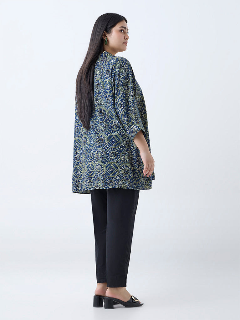 Add a touch of effortless charm to your daily wardrobe with this indigo A-line kurta from Diza. Patterned with an all-over print, it’s styled with a mandarin collar, button-down front, three-quarter sleeves, and a handy side pocket. Easy to wear and effortlessly chic, it’s your go-to piece for casual meetups or relaxed workdays.