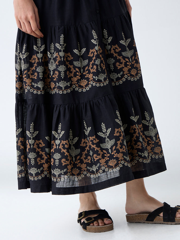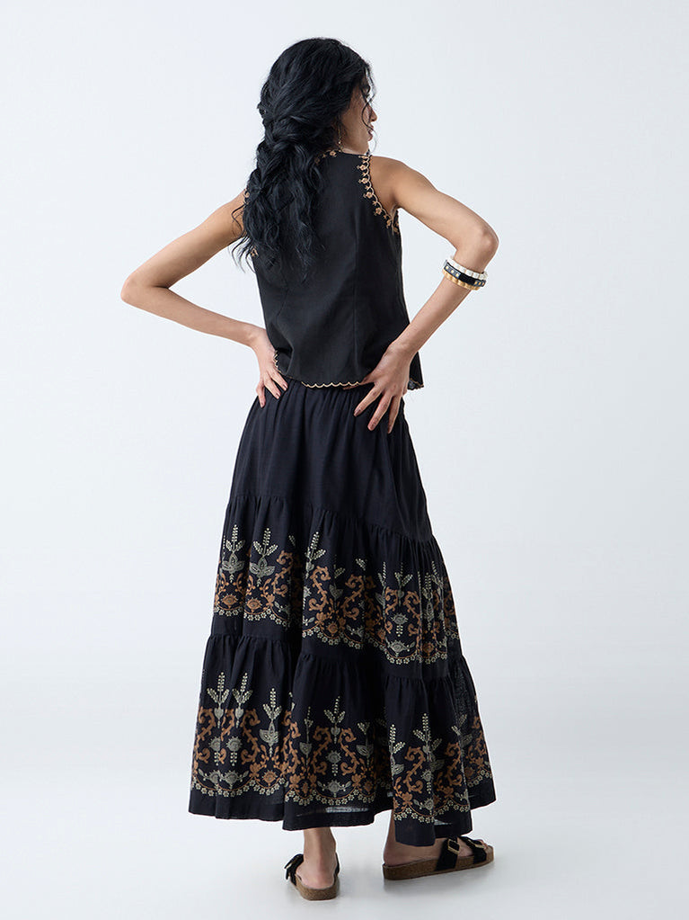 Shaped in a tiered silhouette, this black skirt from Bombay Paisley is detailed with floral motifs for added charm. Milled from a sumptuous fabric for all-day comfort, it is fitted with an elasticated waistband to ensure ease of wear.