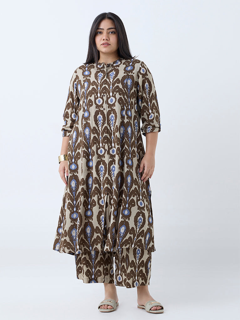 This brown kurta from Diza stands out with its woven ikat-inspired pattern that adds texture and visual interest. Made from high-quality fabric in an A-Line frame, it’s designed with a band collar, a buttoned placket, and three-quarter sleeves for everyday ease. A discreet side pocket adds thoughtful functionality.