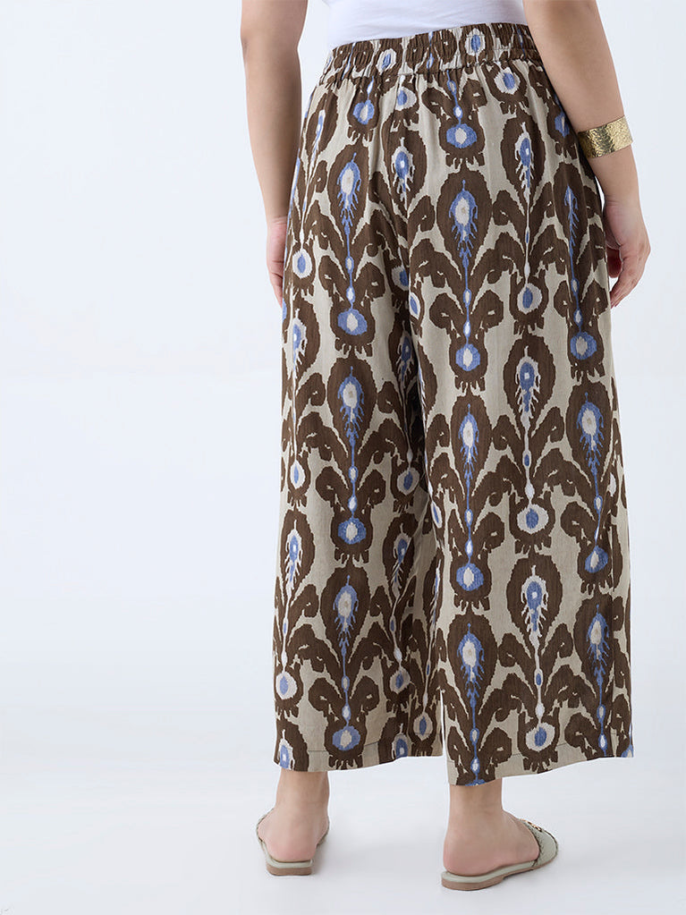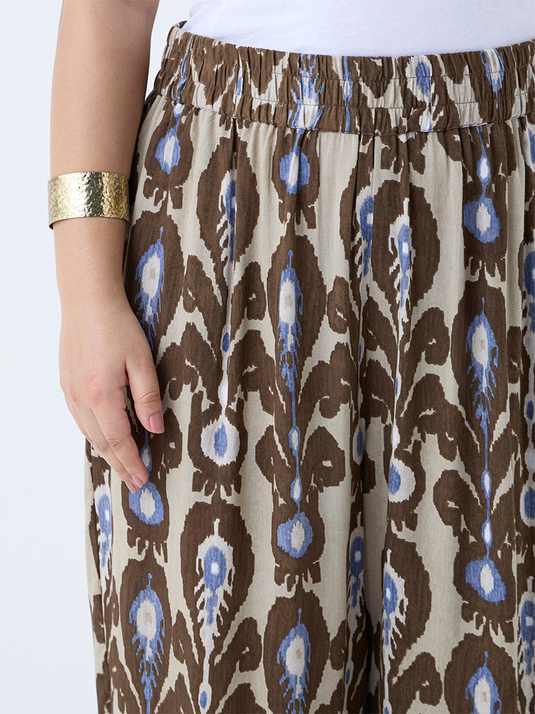 These brown ethnic pants from Diza bring a touch of earthy elegance to your festive occasions. Adorned with ikat-inspired motifs, they’re tailored from high-quality fabric that drapes beautifully over curves. The smooth elasticated waistband ensures all-day ease, while side pockets add practical charm.
