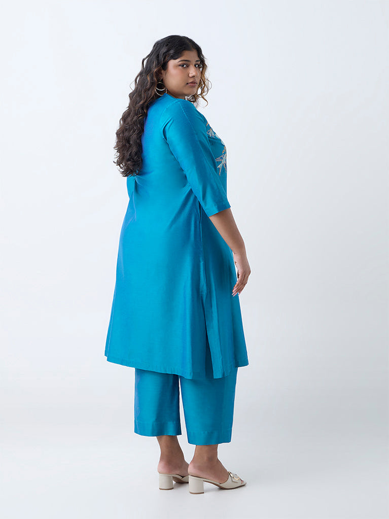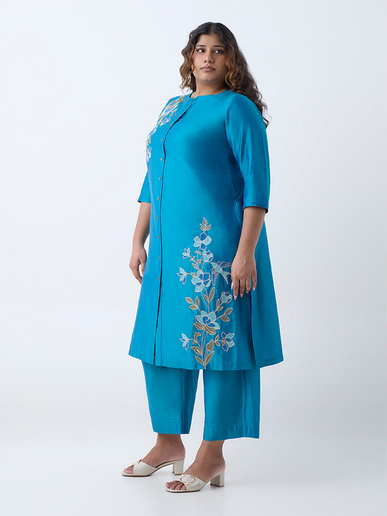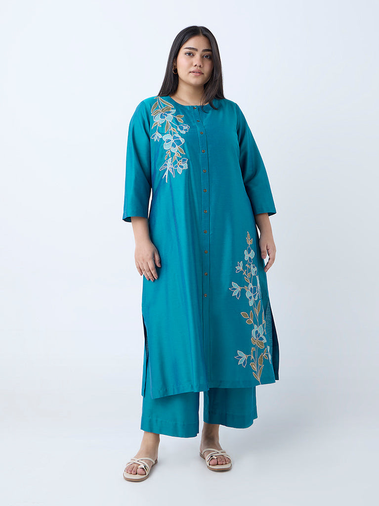 This teal kurta from Diza is constructed from a soft, lightweight fabric in an elegant A-line frame. Displaying striking floral embroidery, it is styled with a round neck, a button-up front and three-quarter sleeves. An ideal pick for festive occasions and casual-ethnic settings.