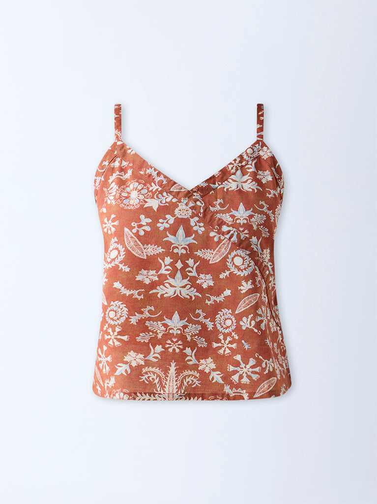 This brown top from Bombay Paisley is made for holiday looks that feel light and carefree. Decorated with a charming botanical print and milled from pure cotton, it’s styled with a flattering V-neck and adjustable shoulder straps for easy, all-day wear.