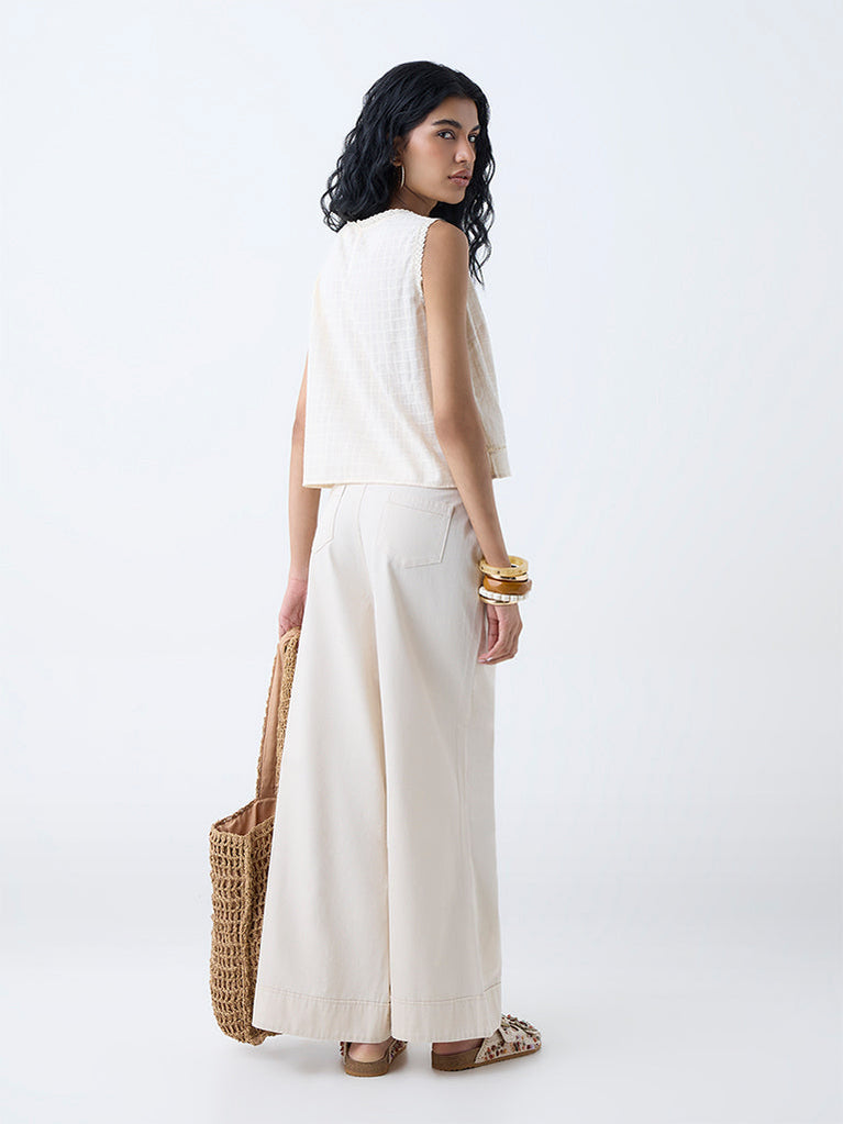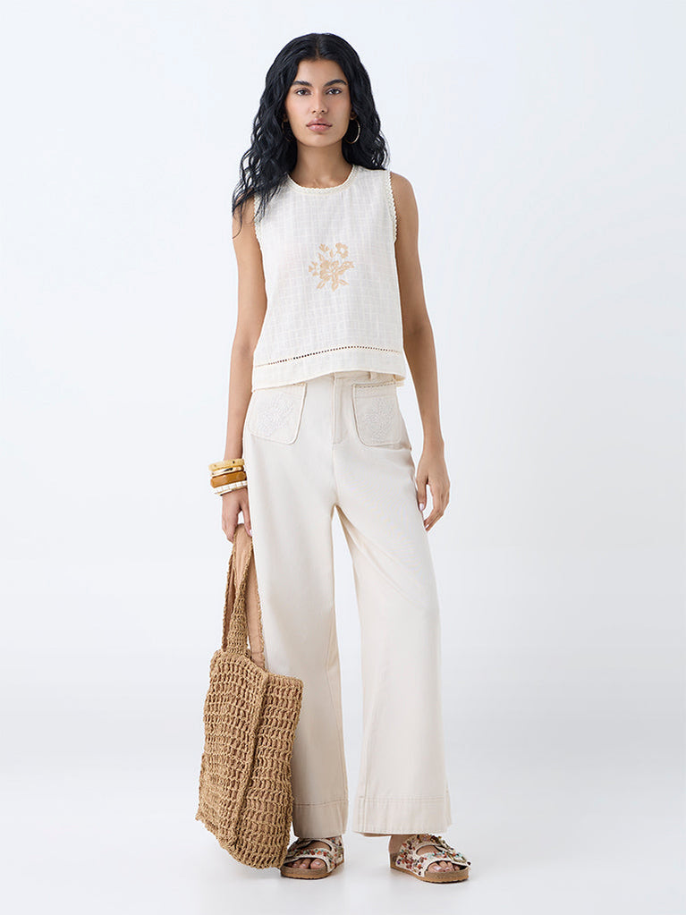 Add a hint of sophistication to your off-duty edit with this off-white cotton top from Bombay Paisley. Designed with a round neck and sleeveless cut, it showcases a subtle checkered pattern that serves as a soft canvas for delicate floral embroidery. Crochet trims along the hemline add artisanal charm, lending a handcrafted finish to the silhouette.