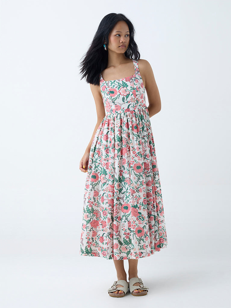 Shaped in A-line dress silhouette, this multicolour dress from Bombay Paisley brings a burst of vibrance with its lively floral print. Created from a rich cotton-blend fabric that offers enhanced breathability, it includes a square neck and adjustable shoulder straps for ease and balance. A concealed back zipper finishes the look with a tailored touch.