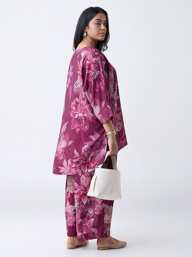 Redefine your festive wardrobe with this plum kurta from Diza, brought to life with vibrant floral prints and touches of gold detailing that lend a subtle shimmer. Crafted in an A-line silhouette with an asymmetrical neckline, three-quarter sleeves, and a handy side pocket, it drapes beautifully to flatter every curve.