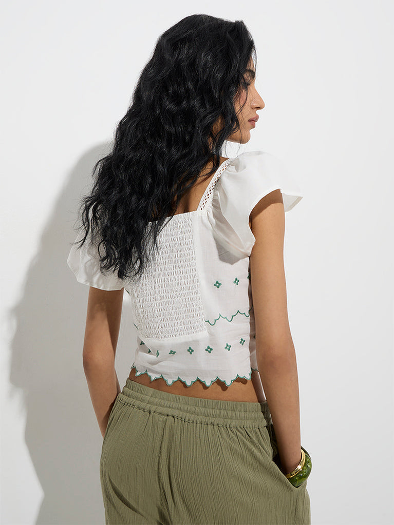 This white top from Bombay Paisley is detailed with floral embroidery that adds charm to your everyday style. Woven from a sumptuous fabric, it features a square neck, airy angel sleeves, and a smocked back that offers ease and flexibility.