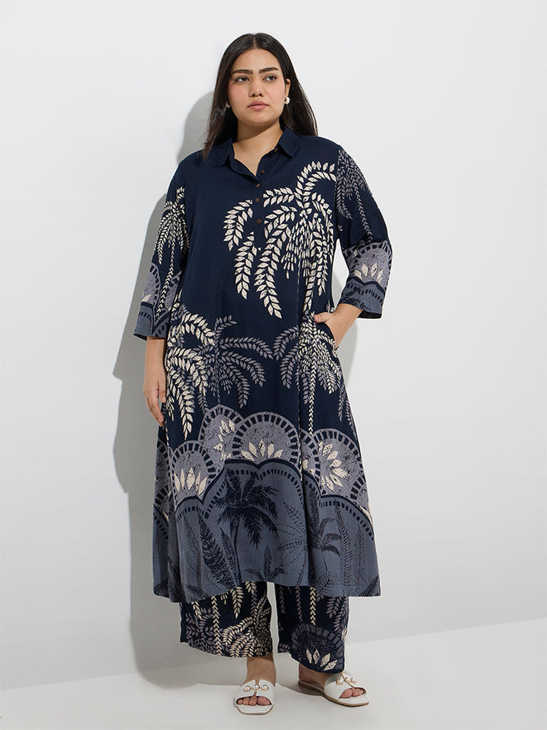 This navy kurta from Diza showcases tropical-inspired prints that lend it a relaxed yet refined appeal. Milled from an ultra-soft fabric and cut in a graceful A-line silhouette, it features a neat collar, a short button placket, and three-quarter sleeves for everyday ease. A discreet slip pocket adds a thoughtful touch of practicality to this wardrobe staple.