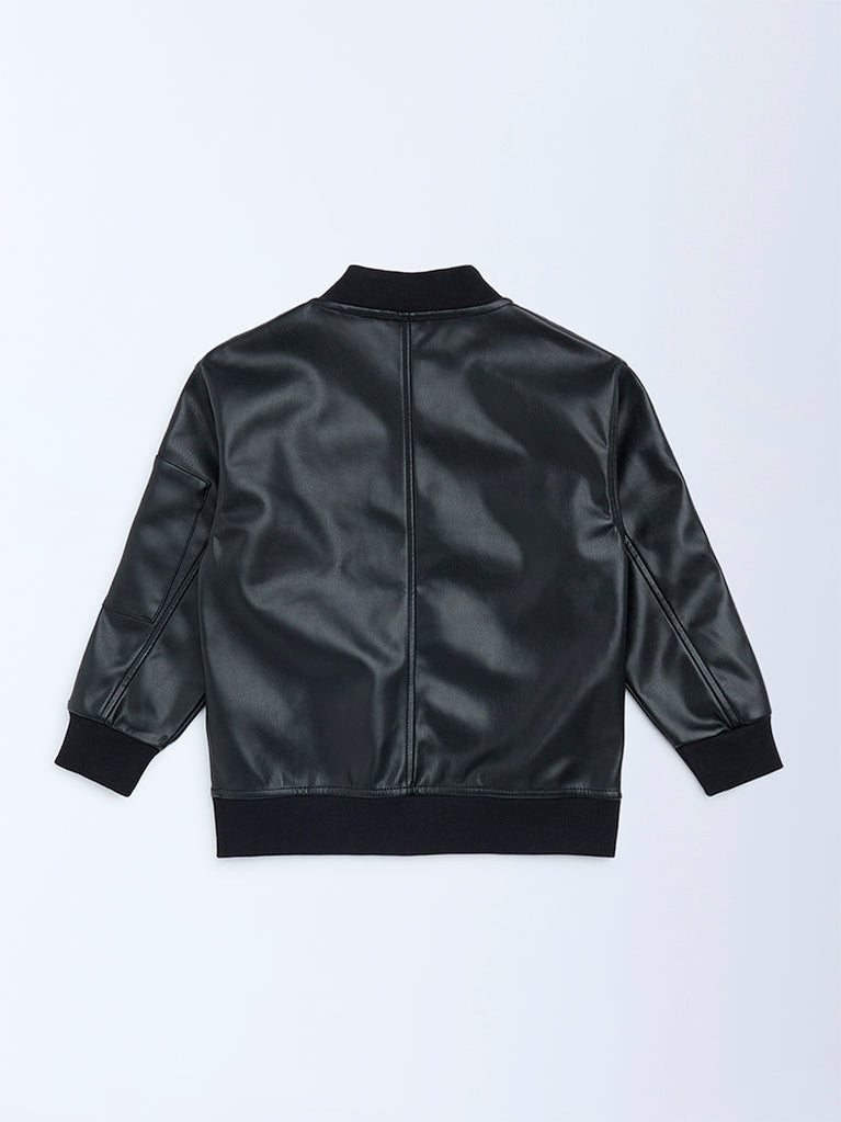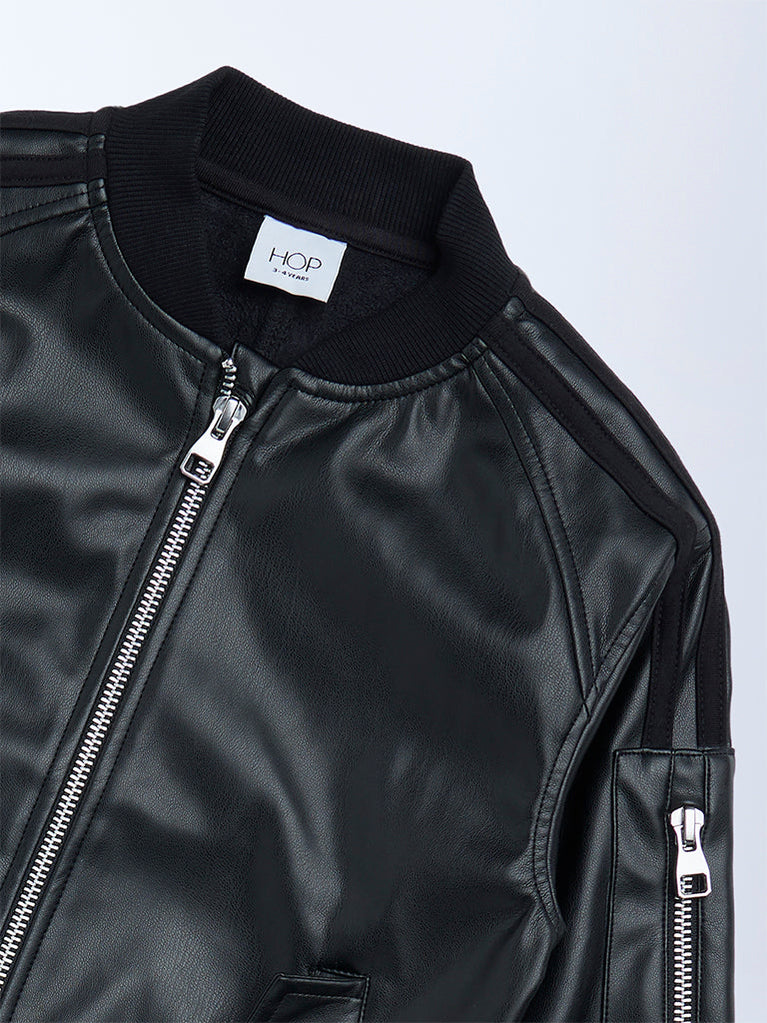 Ready for cool-weather adventures, this black biker jacket from HOP Kids features a sleek faux-leather finish that brings a bold edge to winter outfits. Designed with a ribbed stand collar, practical flap pockets, and a smooth full-zip closure, it offers warmth without restricting movement.