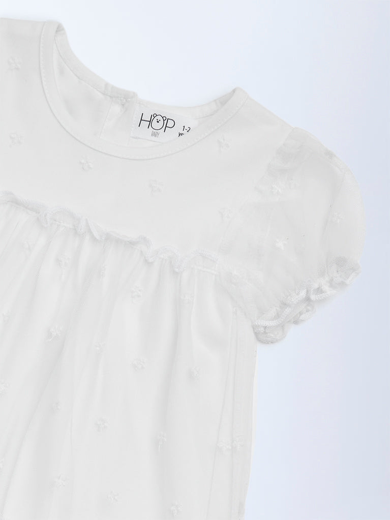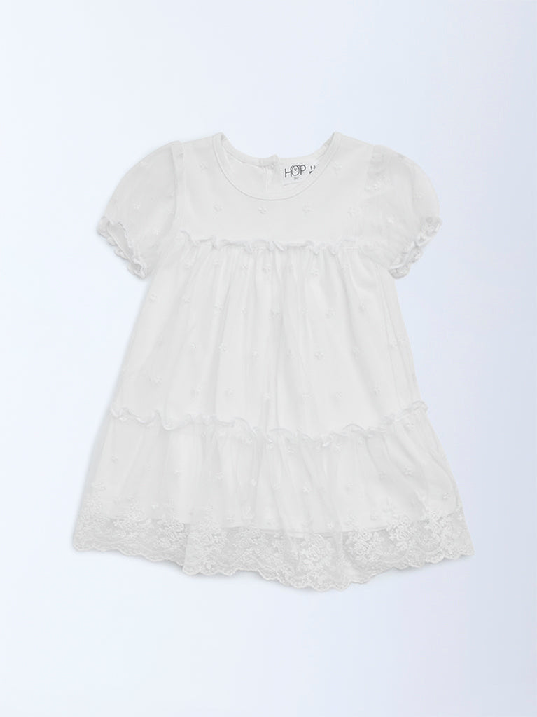 A charming pick for special moments, this white dress by HOP Baby is shaped in a gentle tiered frame that moves beautifully with every little step. Made from a lightweight fabric with a net overlay, it showcases delicate floral lace embroidery that feels soft against the skin. Finished with a crew neck, puff sleeves, and a convenient back button closure, it’s perfect for family gatherings, celebrations, and picture-perfect days.