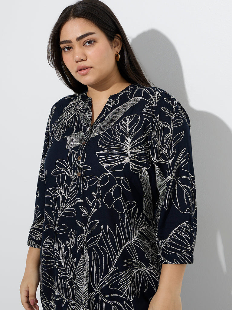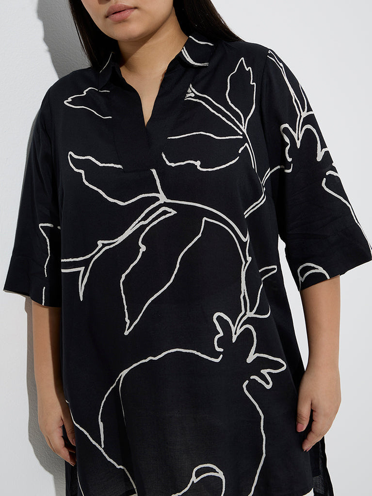 This elegant black tunic from Diza flaunts intricate foliage-inspired prints, adding a touch of nature to its modern design. Crafted from a breathable fabric, it offers both comfort and style. The mandarin neck leads into a quarter-button placket, while the three-quarter sleeves provide a perfect balance of coverage and ease.