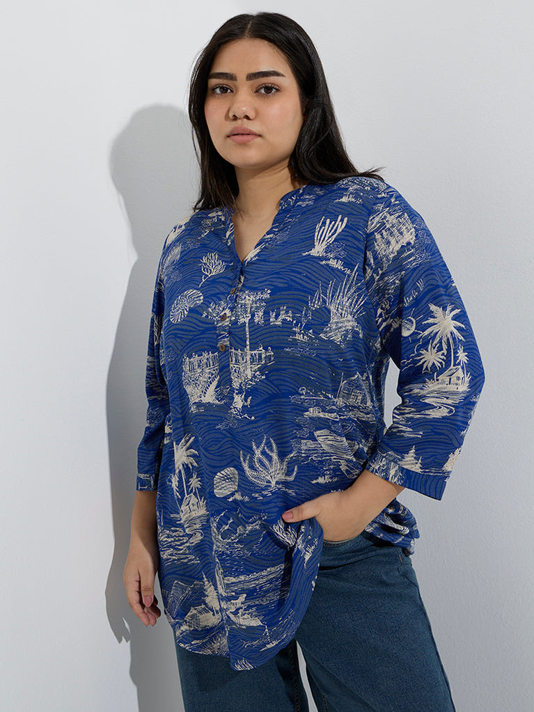 This indigo ethnic kurti from Diza is milled from a super-soft fabric for effortless all-day comfort. Featuring all-over scenic prints, it is detailed with a mandarin neck, a brief button placket, and three-quarter sleeves, blending timeless style with easy wearability.