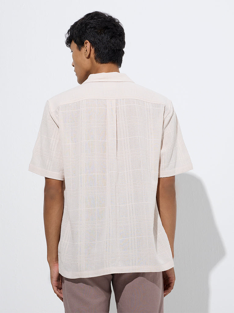 ETA introduces this light pink shirt combining floral embroidery with a subtle checkered design for a refined touch. Featuring a relaxed frame with a camp collar, button placket, and half sleeves, it is crafted from pure cotton for breathable ease and all-day comfort.