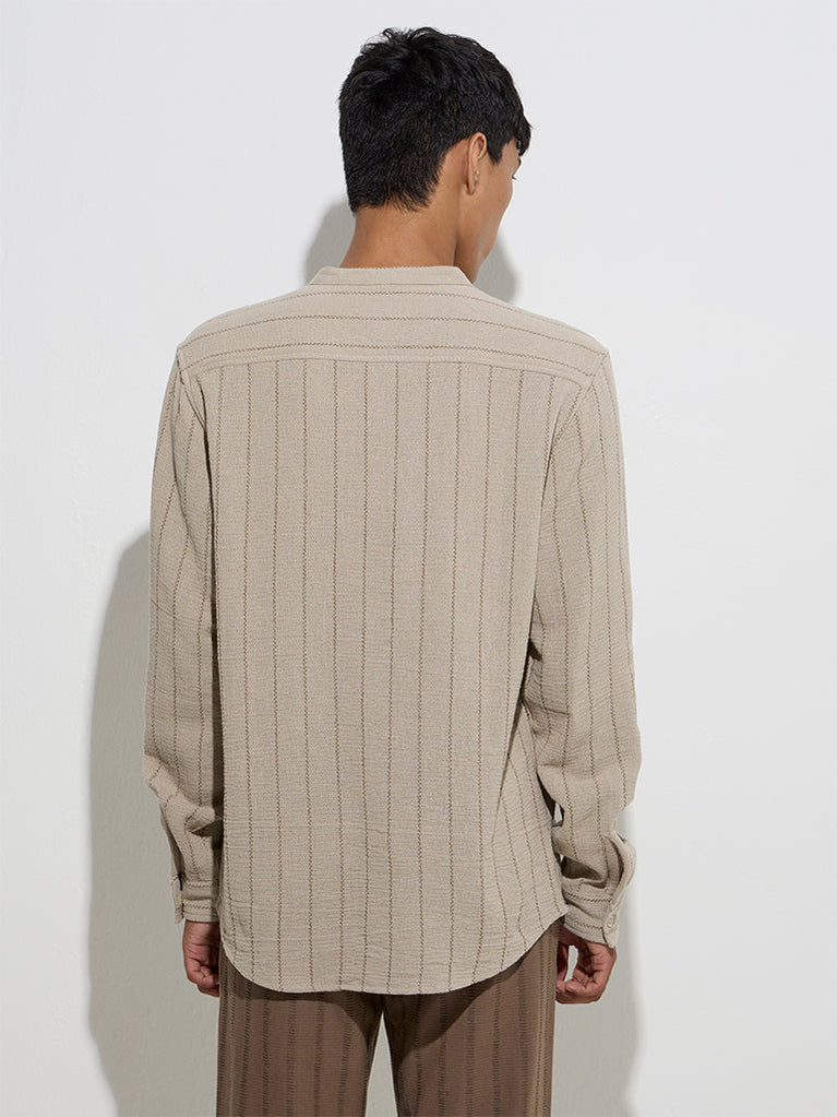 Bring earthy tones to your wardrobe with this dark beige shirt from ETA. Made from pure cotton in a relaxed fit, it features subtle stripe detailing, a band collar, full sleeves, and a button-down front — ideal for effortless everyday style with a refined edge.