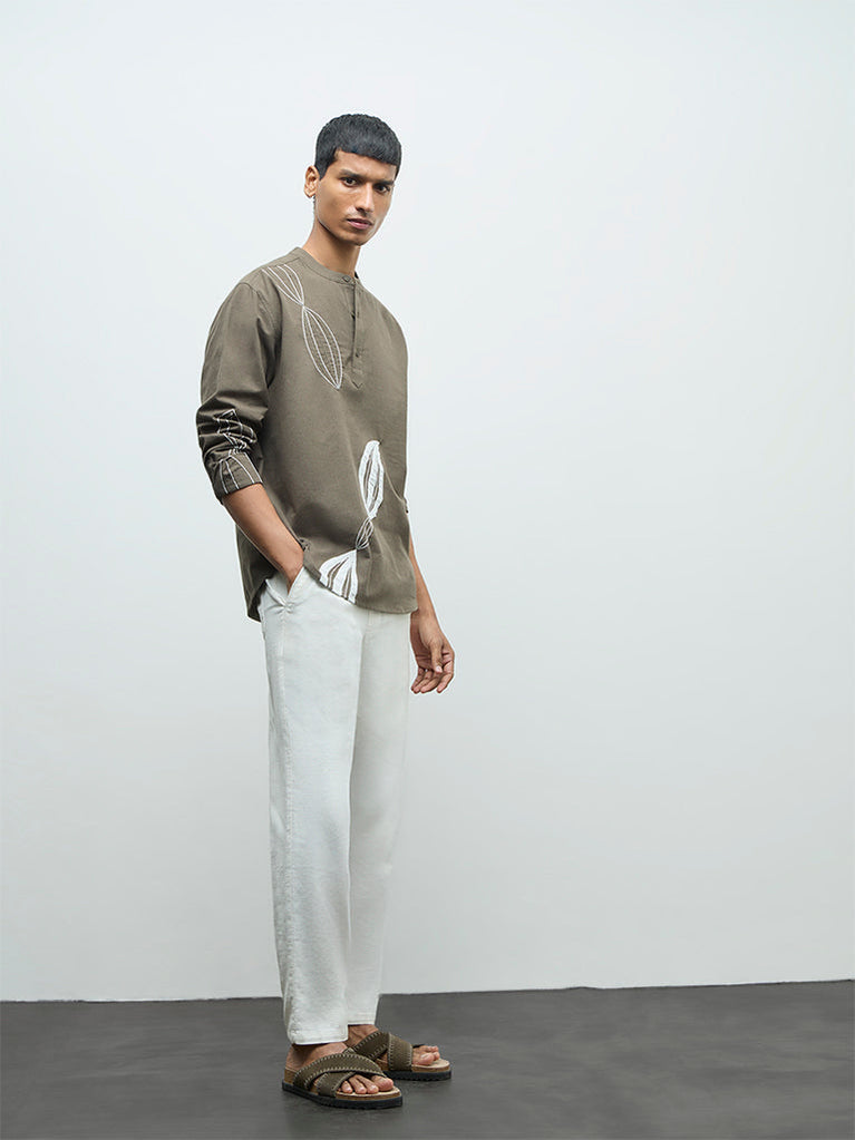 Offering a refined take on casual dressing, this olive shirt from ETA features embroidered detailing placed across the front and full sleeves. It is built from pure cotton fabric in a relaxed silhouette for breathable, all-day comfort. Styled with a band neck and a short button placket, this is an easy option for elevated off-duty wear.