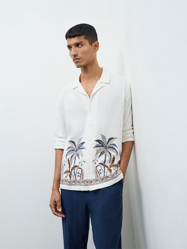 Strike a refined note with this off-white shirt from ETA, detailed with tropical embroidery along the hem. Cut in a relaxed silhouette, it features a notched collar, full sleeves and a classic button-up front. Crafted from a soft, cotton-rich fabric, it offers breathable comfort through the day and into the evening.