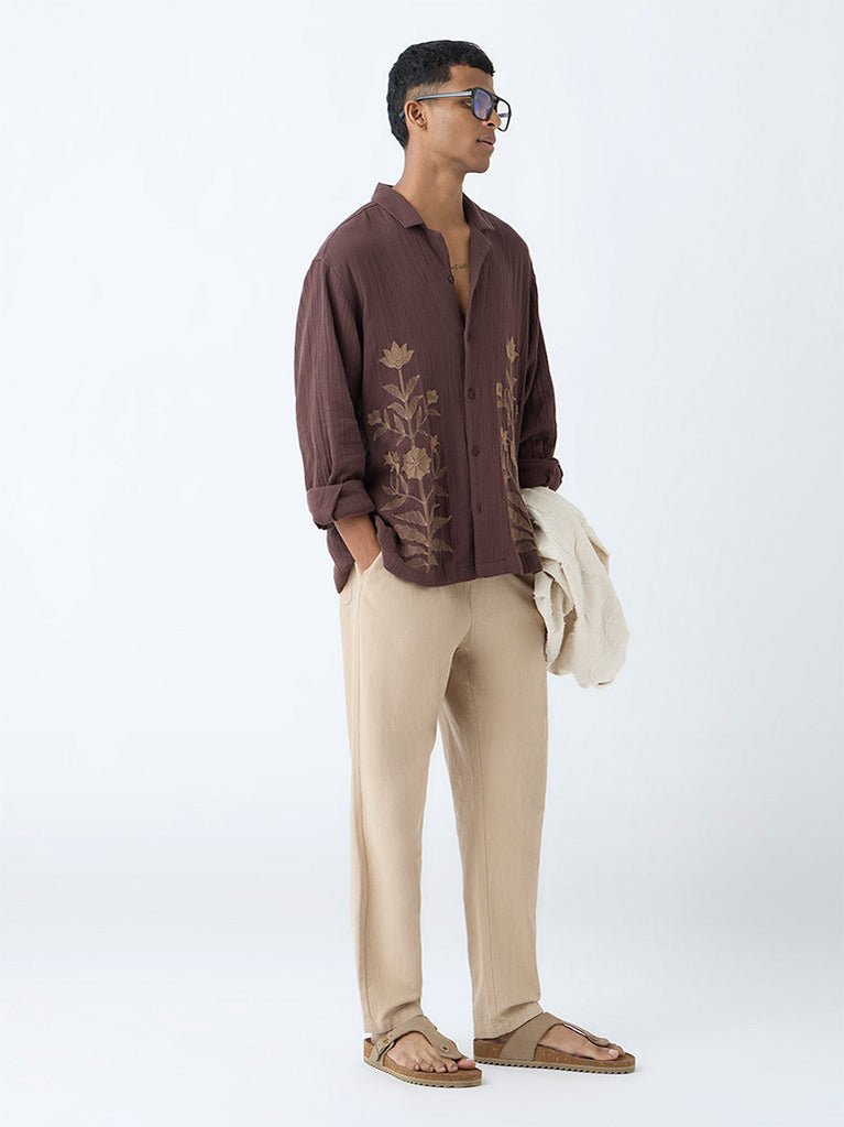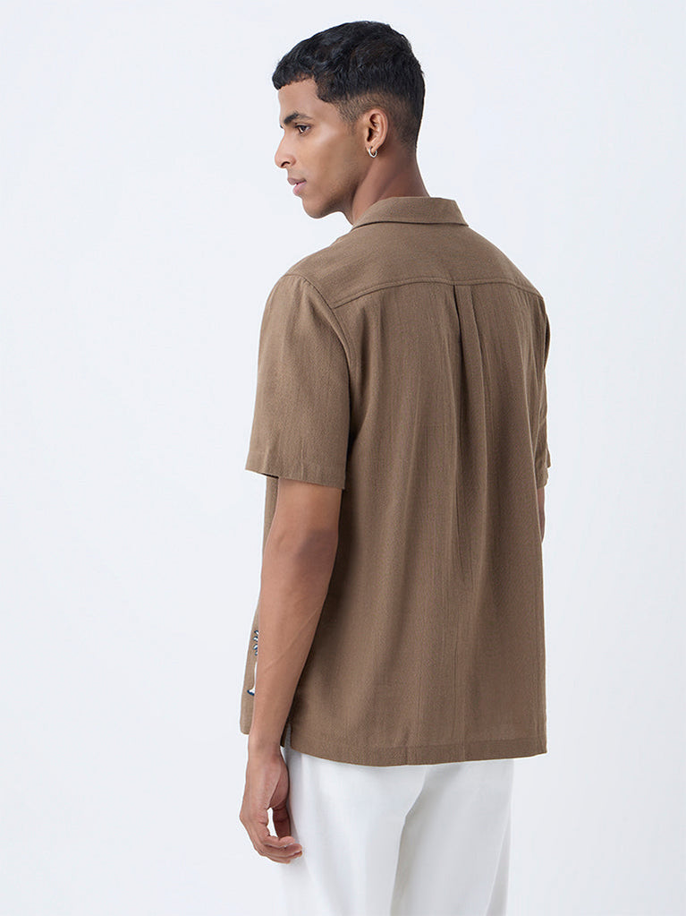 ETA Brown Embroidered Relaxed-Fit Cotton Shirt