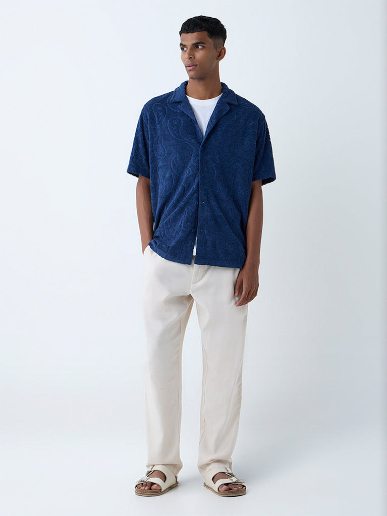 Make every outing effortlessly stylish with this indigo shirt from ETA. Showcasing abstract embroidery on a relaxed silhouette, it blends contemporary design with casual ease. Structured with a mandarin collar, button placket, and full sleeves, the cotton-rich garment ensures utmost comfort from AM to PM.