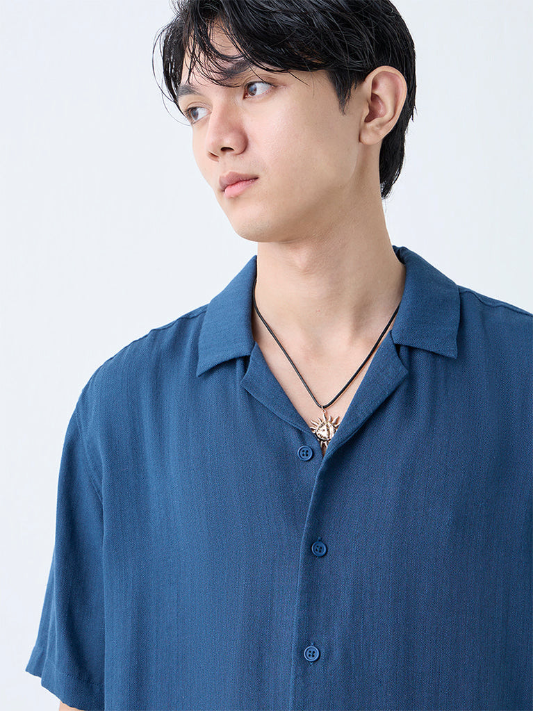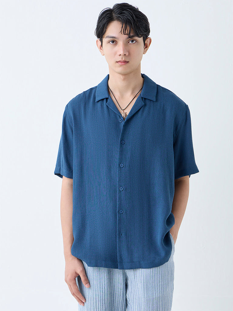 Defined by its contemporary tone, this teal shirt from ETA is an easy upgrade to your everyday line-up. Tailored in a relaxed silhouette, it features a camp collar, short sleeves, and a button placket that lend it a versatile appeal. Its breathable fabric composition ensures comfort from AM to PM.